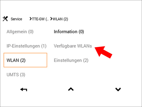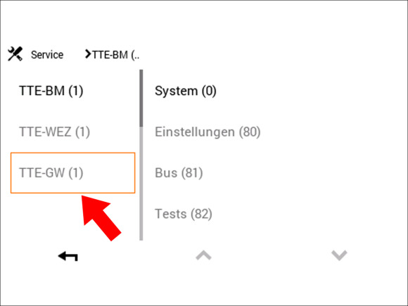Hinweis: Sollte die Option "TTE-GW" nicht direkt sichtbar sein, klicken Sie auf die Pfeiltaste unten rechts um nach unten zu scrollen bis der Menüpunkt "TTE-GW" angezeigt wird.