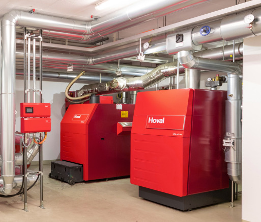 Bivalentní topný systém skládající se z plynového kondenzačního kotle UltraGas a kotle na pelety BioLyt od společnosti Hoval.