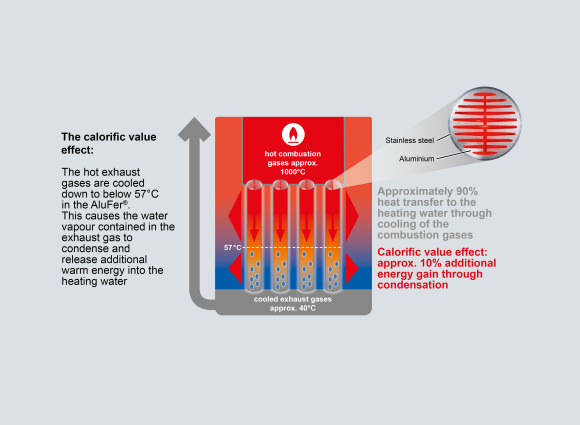 Kondenzační technologie je efektivní metoda, která dokáže mnohem lépe využít energii, čímž šetří zdroje a chrání životní prostředí. Klíčovým prvkem této technologie je kondenzace: topné plyny obsahují páru, která uchovává velké množství latentní energie. Když se pára ochladí pod 57 °C, kondenzuje a uvolňuje tuto energii. Díky kondenzační technologii se topný plyn ochladí z 1000 °C na pouhých 40 °C, přičemž veškerou svou tepelnou energii přenese do topného systému. U starších plynových kotlů, které pracují při mnohem vyšších teplotách spalin kolem 200 °C, uniká velké množství nevyužité tepelné energie komínem. Ve srovnání s těmito konvenčními nízkoteplotními kotli dosahuje plynový kondenzační kotel dodatečných energetických zisků až o 20 %.